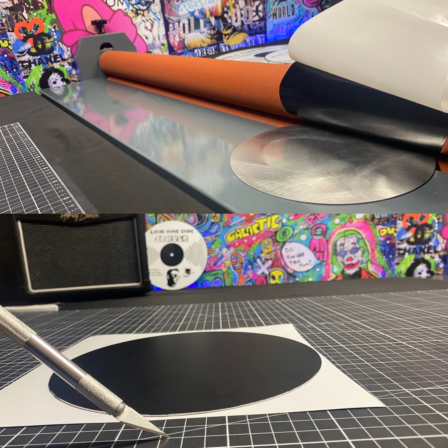 Der Schritt der Folierung ist äußerst aufwändig, da zuerst die Aluminiumplatte mit einer Grundfarbe foliert werden muss. Dies geschieht, indem die Folie mithilfe eines Rollenlaminators auf die Platte gepresst wird. Anschließend muss das individuell vom Kunden gestaltete Schnittmuster von einem Schneideplotter ausgeschnitten werden. Nachdem dies erledigt ist, wird die Folie von den unbrauchbaren Resten gelöst und vorsichtig auf die Platte aufgeklebt. Wenn alles sicher und luftdicht verklebt ist, ist das Produkt versandfertig.